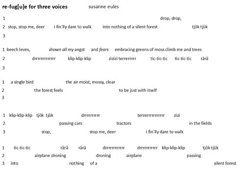 re-fug[u]e attempts to reflect the emotional, visceral and spiritual experiences of multiple visits to a forest that has an uncanny, fairytale-like, if not mystical, aura. The first associations regarding an artistic rendering of those aspects that came to mind were polyphonic voices, as in Renaissance music. First, Arvo Pärt's a cappella choir of four voices, "The Deer's Cry" and then Orlando Gibbons' madrigal "Drop, Drop Slow Tears." I set my text to Gibbons' music as a parody, but the aspect of refuge ultimately evoked the compositional technique of a three-part fugue, re-fug[u]e.