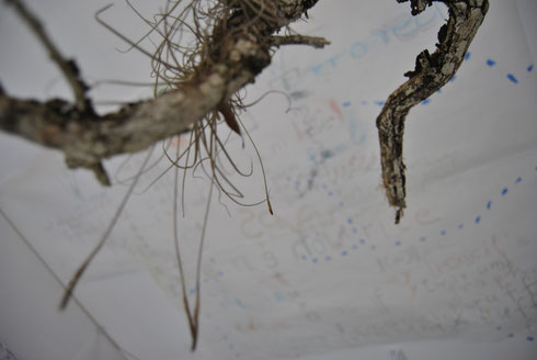 wax aquarelle, pencil, tea bag, found pine needles, branches & epiphytes