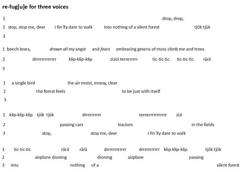 re-fug[u]e attempts to reflect the emotional, visceral and spiritual experiences of multiple visits to a forest that has an uncanny, fairytale-like, if not mystical, aura. The first associations regarding an artistic rendering of those aspects that came to mind were polyphonic voices, as in Renaissance music. First, Arvo Pärt's a cappella choir of four voices, "The Deer's Cry" and then Orlando Gibbons' madrigal "Drop, Drop Slow Tears." I set my text to Gibbons' music as a parody, but the aspect of refuge ultimately evoked the compositional technique of a three-part fugue, re-fug[u]e.